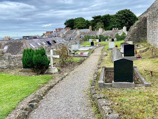 We walk up the hill to St Mary's Abbey and Cemetery (ruin, thirteenth century). The church walls and the graves lie on a flat plateau. The Eye floats above the old 'crenellated' retaining wall and melts into the ivy and moss growing on the stones. The space is clean and well-kept, but several stones are broken or toppled. The white crosses counterpoint the sailing masts and the cranes in the marina below.