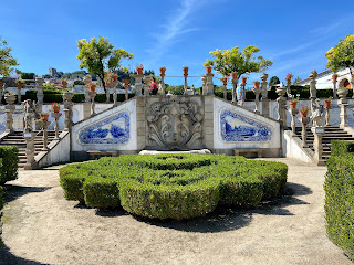 We find the reason for this sense of being "out-of-place" at the nearby Jardim do Paço de Episcopal (eighteenth century). One of the azulejos panels shows the Cruzeiro in front of a small chapel, demolished in the twentieth century. The Cruzeiro now atop a praça that is the roof of a car park.