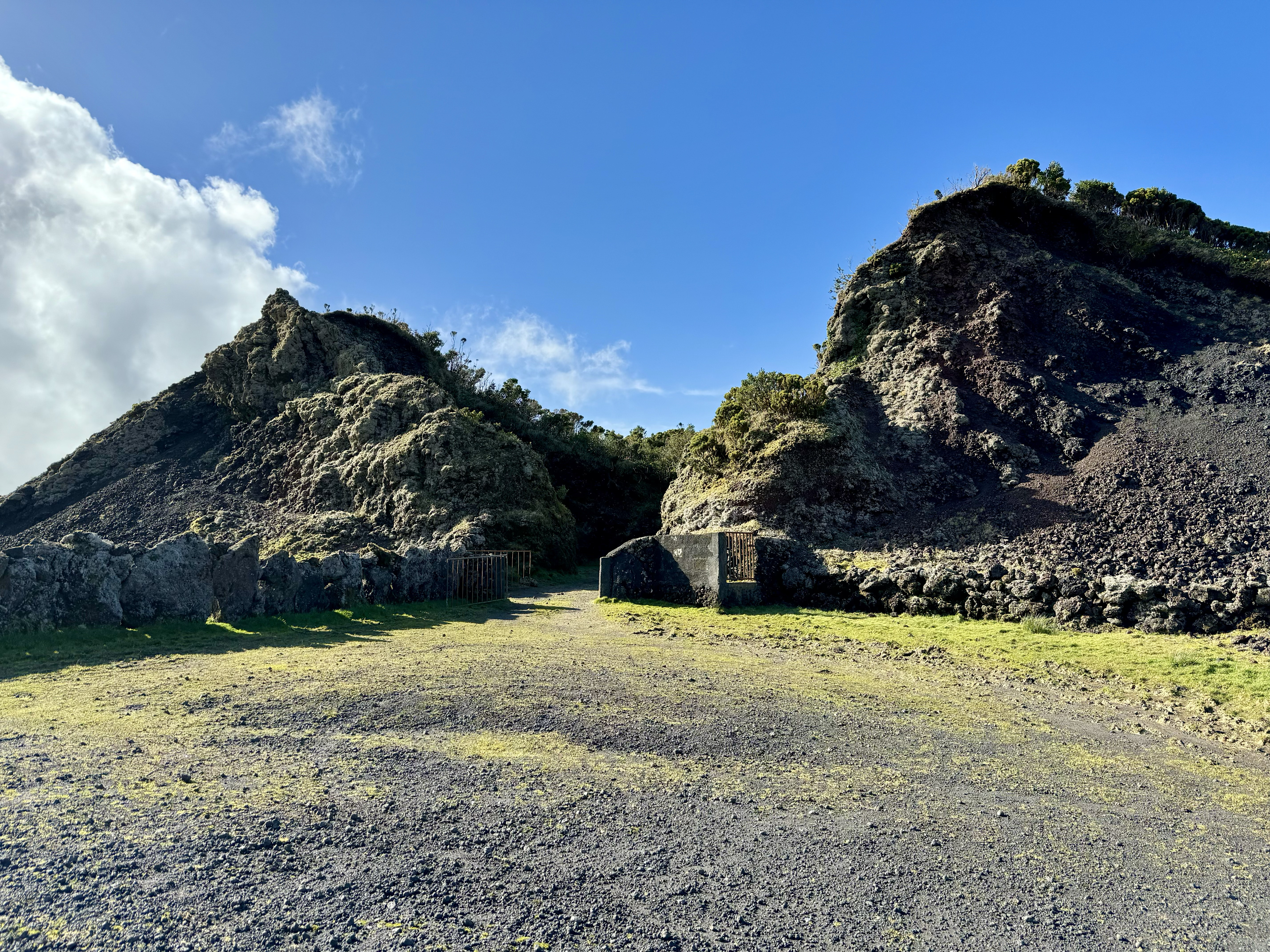 After lunch, we head west along the northern slope of the Montanha on the Estrada Longitudinal (R3-2ª). We can just make out the Ilha de São Jorge on one side and the summit on the other. We turn off the highway and onto a road 'paved' with rough volcanic gravel – not a dirt road, but not smooth at all. From time to time, there are gates and drainage grates made from pipes. The slopes are lumpy and viridescent, and there are several smaller caldeiras dotting the desolate terrain.