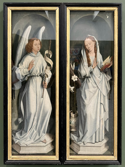 The next two panels by Memling appear to be a diptych, but are in fact parts of another triptych, the Crabbetriptiek. The panels form an Annunciatie (1467), which are the reverse or the outer wings; though not in the typical grisaille, the pale figures are dressed in white, so the effect is similar. The fronts are located in the Pierpont Morgan Library in New York (left panel, right panel). The center panel, the Kruisiging (crucifixion), is kept in the Museo Civico in Vicenza. This joins a series of Annunciations by Memling.