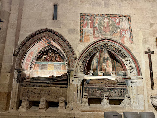 The last capilla on the south aisle contains the door to the Catedral Vieja (de Santa María de la Sede, 12th century). We enter from a narrow stair on the north aisle of the old church, stepping to the west, and descending to toward a faded blood-orange fresco. A rider is brandishing his sword, not to strike the old man, but to cut his cloak – he must be San Martín, who we met yesterday, sharing with the beggar.